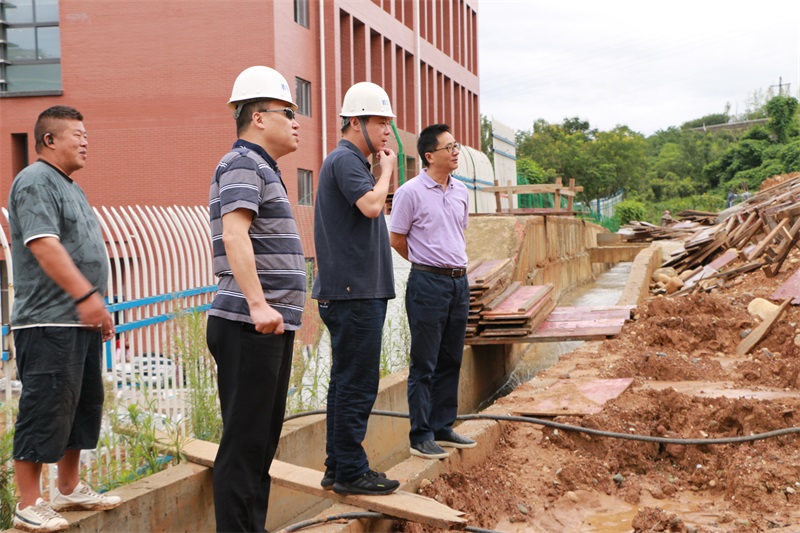 在绵阳中学实验学校综合楼背后排水沟和南山中学实验学校足球场外挡墙防洪安全隐患整改现场,陈建强董事长查看了近日连续暴雨对格构式挡墙的影响,叮嘱科达置业公司要加强现场施工安全管理,重点加强对挡墙、排水沟及边坡的观测,遇到险情立即上报,保障校内建筑安全。