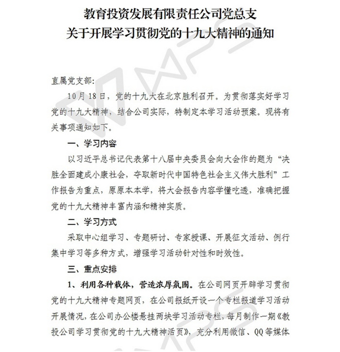 教投公司党总支以实际行动将学习贯彻十九大精神引向深入