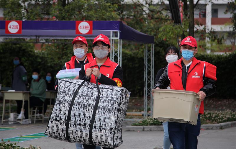 为防止大量人员聚集,严禁家长进入校园,按照事先安排,本次志愿服务分组分校进行,主要服务内容为开展教育园区文明交通疏导、人员比较密集处文明疏散及帮助学生提取个人行李等。从1日上午8时开始,在高三年级第一个学生入学报到前,志愿者们已配合社区民警、学校保安分布在园区各点位。在学校统一入口,每校设置了A、B两个通道入口,用警戒线拉出了男生通道、女生通道、行李搬运组、行李中转站、消杀组等小块区域,地面上,保持安全距离的红色一米线清晰醒目,志愿者们组织学生排队间隔一米排队陆续测体温、消毒入校。志愿者们帮助返校学生将行李统一运送到了校内特设的防疫爱心中转站,再由校内志愿服务队员搬运至寝室。