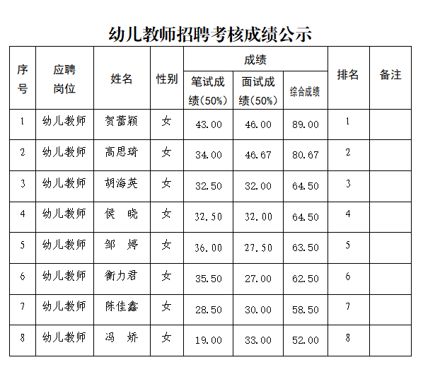 附件:幼儿教师招聘考核成绩及排名