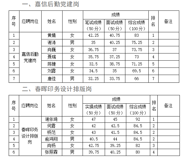 根据绵阳嘉信学校后勤管理服务有限公司《招聘公告》相关流程,7月22日开展了嘉信后勤党建岗招聘工作,符合资格审查条件人员12人(其中5人因个人原因未参加,实际参加人员7人),采取笔试、面试方式综合评定。7月26日开展了春晖印务设计排版岗招聘工作,符合资格审查条件人员7人(其中1人因个人原因未参加,实际参加人员6人),采取实操、面试方式综合评定。现将成绩公示如下: