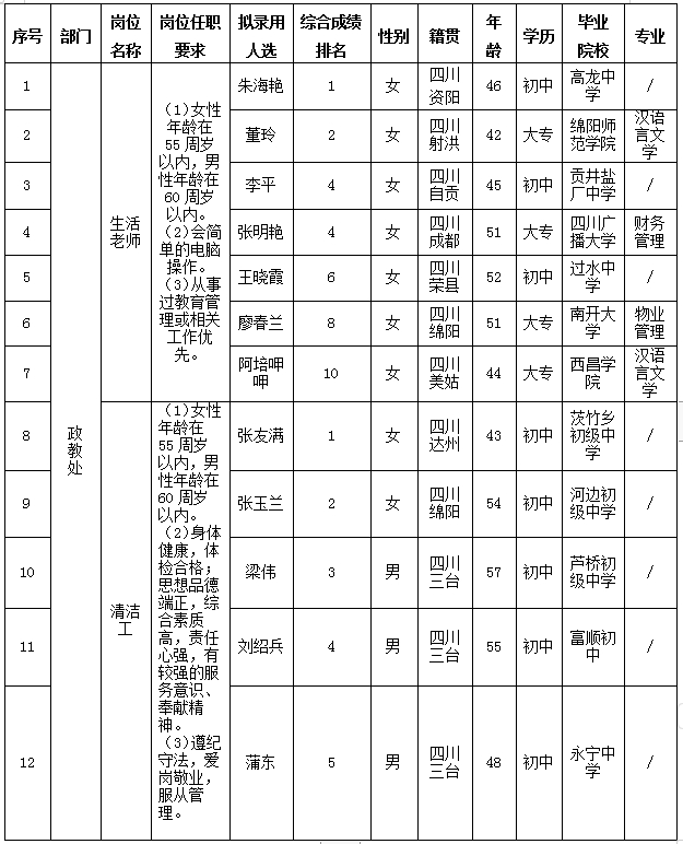 绵阳中学实验学校关于招聘生活老师等岗位拟录用人员的公示(第一批)