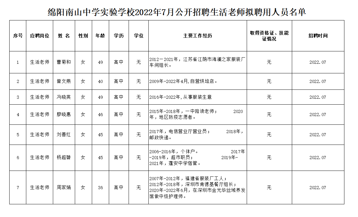 绵阳南山中学实验学校2022年7月公开招聘生活老师拟聘用人员公示