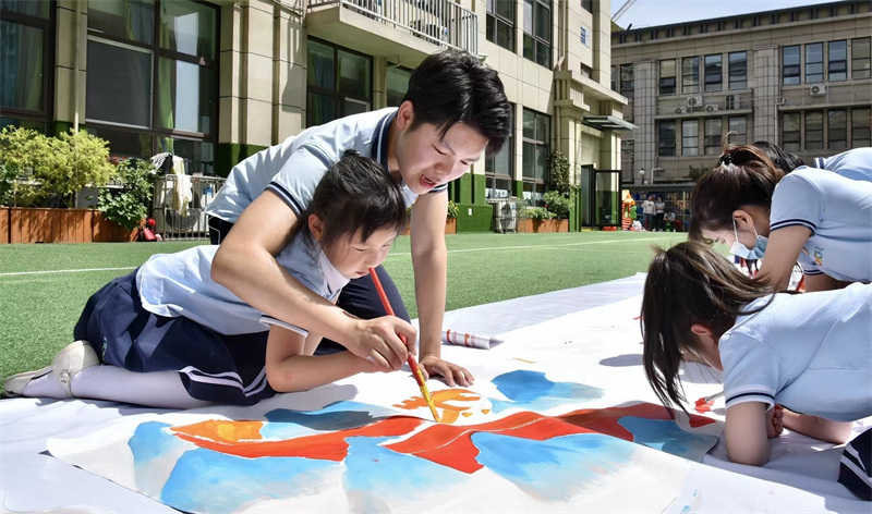 教师和孩子们围绕着一条长长的白色画卷旁,他们或立、或坐、或俯、或卧,尽情涂抹挥洒......长卷中,既有团徽、‘五四’旗帜等元素图案,又有长城、天安门、摩天大楼等祖国繁荣富强的景象,表达出青年教师和孩子们对共青团100周年的祝福和对幸福生活的热爱。