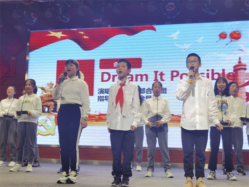 一面旗帜是点燃信念的火,照亮心灵的灯。科技领先,生活幸福是炎黄子孙期待的梦。同学们合唱《dream it possible》,通过歌声唱响新时代,共筑中国梦。