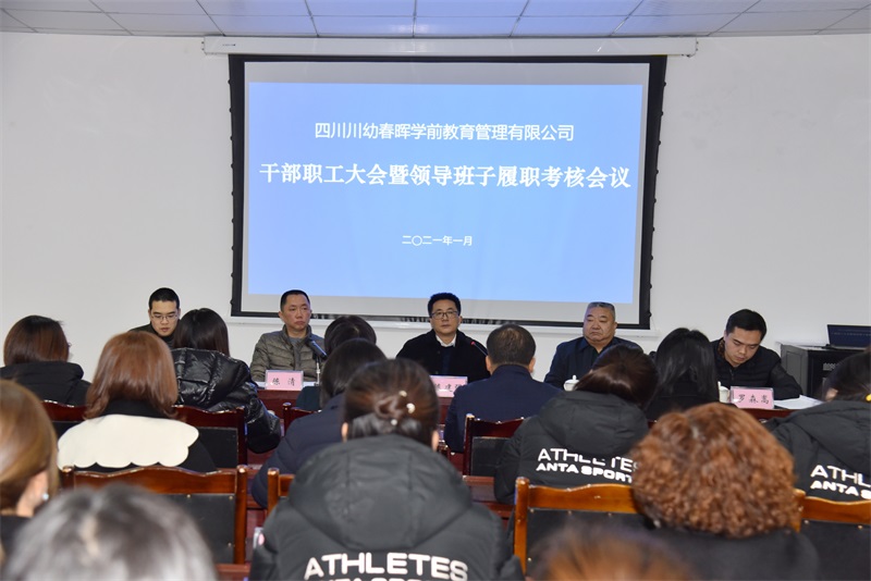 1月27日,川幼春晖2020年度干部职工大会和领导班子、综合履职考核会议召开。公司领导班子成员、部门负责人、各园园长作为“考生”依次登台述职述廉,晒成绩、找差距、谈举措,接受此次年度“大考”。教投集团党委书记、董事长陈建强现场点评并作讲话。集团公司党委副书记蒲昌文主持会议。集团公司副总经理、川幼春晖董事长陈清代表川幼春晖班子作述职报告。