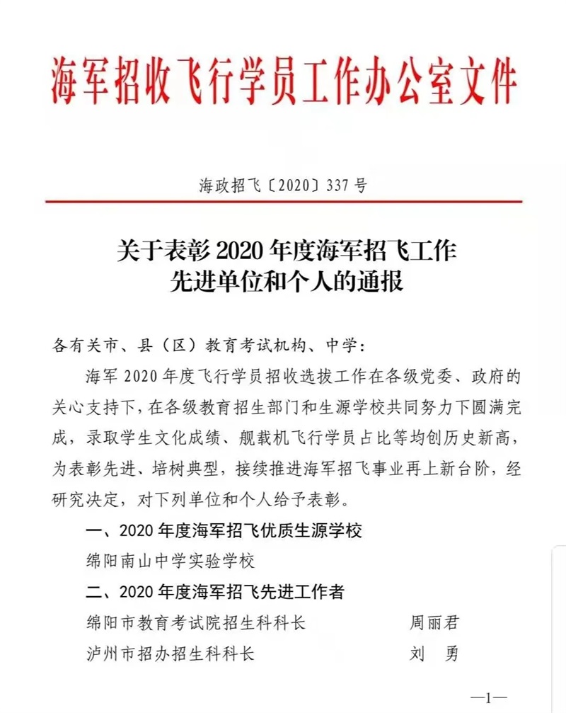 为强军助力,与梦想同行。近日,绵阳南山中学实验学校被授予“2020年度海军招飞优质生源学校”荣誉称号,这是全省唯一一所获得此项殊荣的学校。此外,南山实验还被评为“绵阳市2020年招飞工作特等奖”。